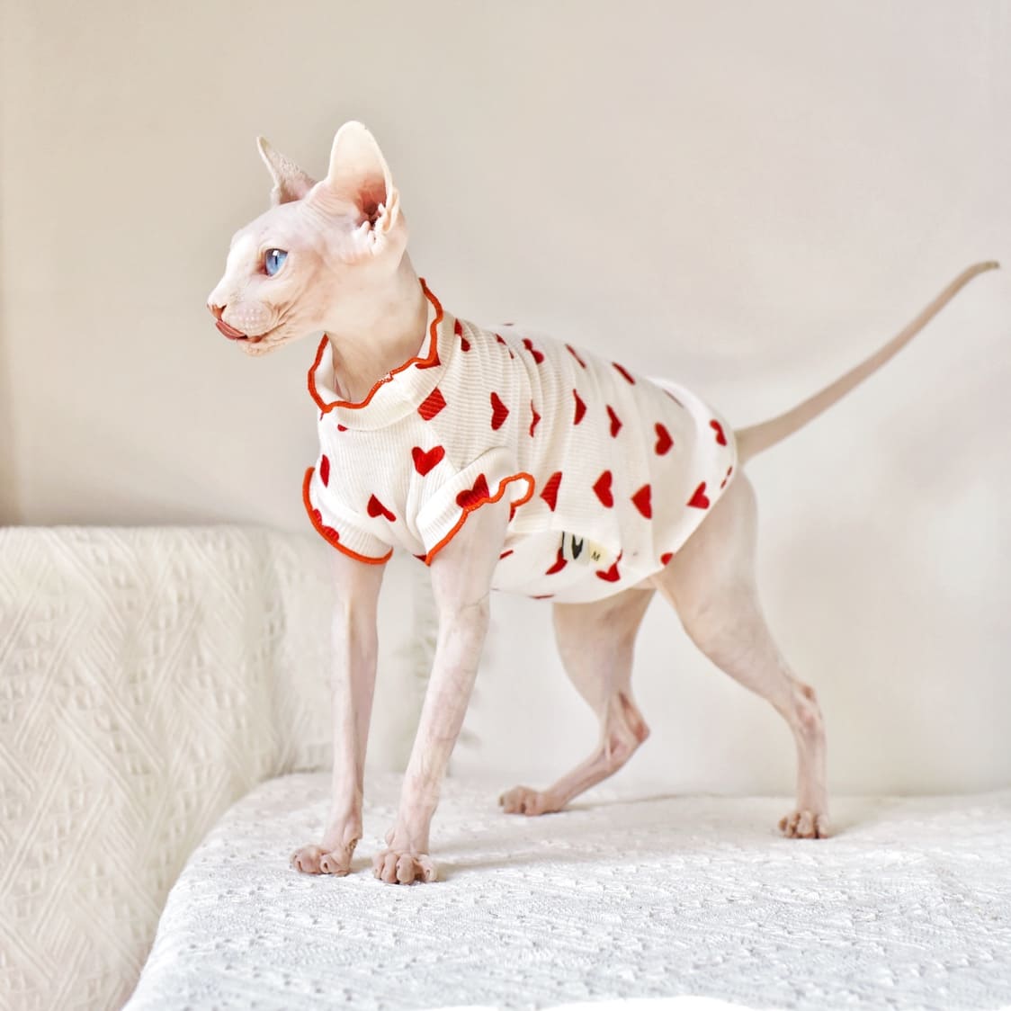 This is a sleeveless shirt for Sphynx with a simple design. The fabric of this hairless cat sleeveless shirt is pure cotton, which is very breathable and soft. The overall color of this Tank top for Sphynx cat is white with a black and red heart print on it. Such a design is simple and cute. Because it is a thin sleeveless shirt, it is recommended that hairless cats wear it in summer. Regarding the size, please choose according to the measurements of your cat. If you have any questions, please contact us directly. Find more Sphynx cat clothes.