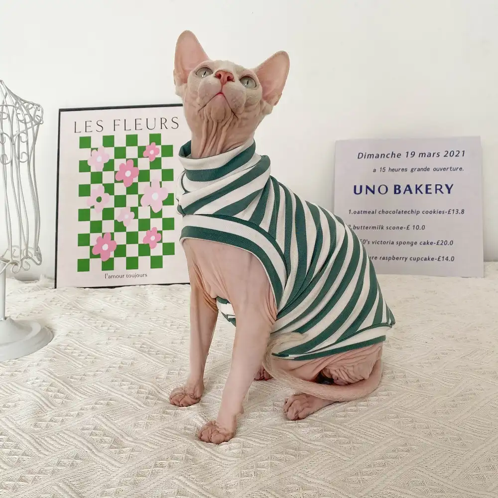 This striped color t-shirt for Sphynx is made by Yeswarmg to make your pet look the most beautiful. The stripe design is simple and lovely. This baby shirt for cats is perfect and comfortable. Stepped design and abdominal packaging make it easy for your pet to put on and off quickly. This cat t-shirt for cat is made of machine-washable fabric, easy to keep dry, and easy to go for a walk. It is an indispensable fashion piece to maintain the perfect appearance of pets. Find more at Sphynx cat clothes.